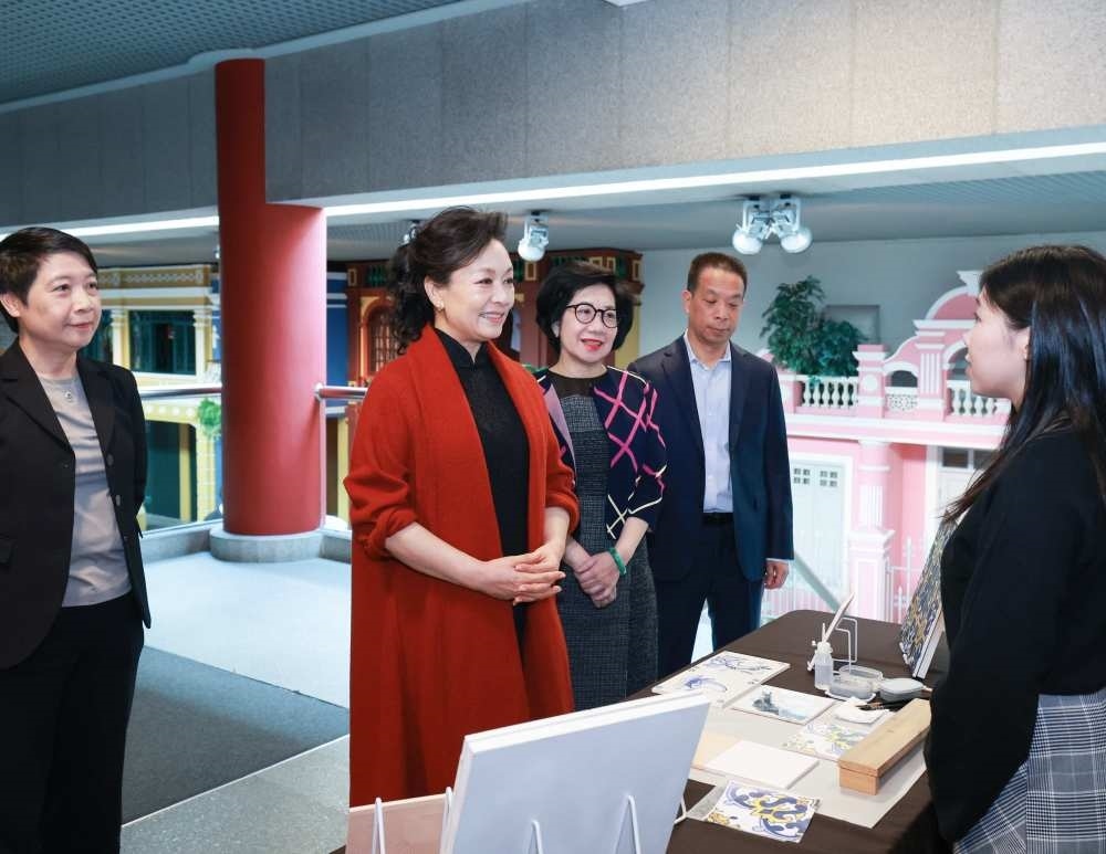 12月19日上午,國(guó)家主席習(xí)近平夫人彭麗媛在澳門(mén)特別行政區(qū)行政長(zhǎng)官賀一誠(chéng)夫人鄭素貞陪同下,來(lái)到澳門(mén)博物館參觀。彭麗媛仔細(xì)察看館藏文物,深入了解澳門(mén)的歷史變遷和中西交融的建筑、行業(yè)、文化生活等情況,同當(dāng)?shù)卮纱u畫(huà)制作、木雕等非遺傳承人親切交流。