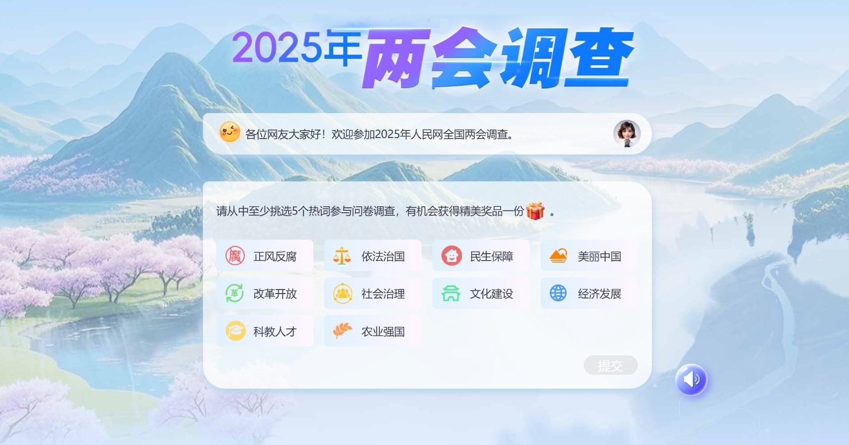 您期待哪些保障和改善民生領(lǐng)域的改革舉措落地?您認(rèn)為提升社會治理水平應(yīng)重點改進哪些方面?全面推進依法治國的系列舉措您對哪些最為關(guān)注……2025年全國兩會召開期間,人民網(wǎng)記者將把調(diào)查結(jié)果和網(wǎng)友心聲帶給代表委員。