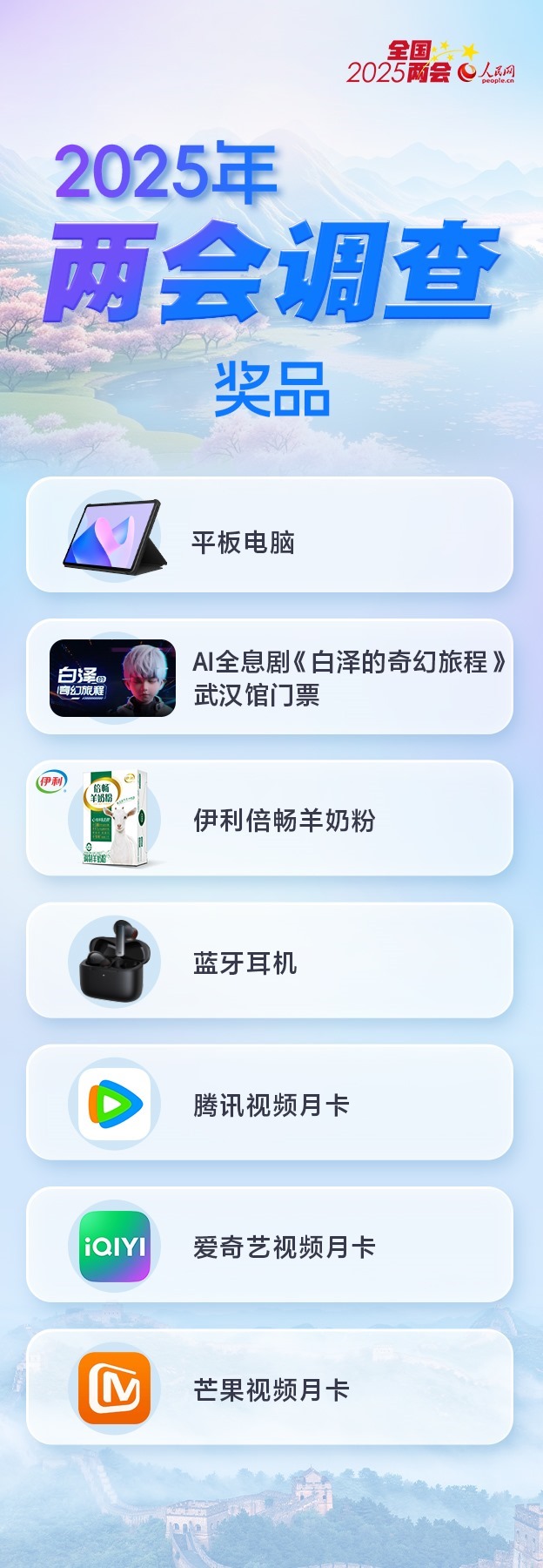 調(diào)查還在火熱進行,各界可繼續(xù)通過人民網(wǎng)全媒體通道參與本次調(diào)查。為感謝網(wǎng)友對人民網(wǎng)2025年全國兩會調(diào)查的支持,參與者有機會抽取精美獎品。