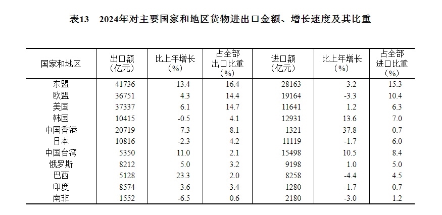 全年貨物進出口總額438468億元,比上年增長5.0%。其中,出口254545億元,增長7.1%;進口183923億元,增長2.3%。貨物進出口順差70623億元。對共建“一帶一路”[50]國家進出口額220685億元,比上年增長6.4%。其中,出口122095億元,增長9.6%;進口98589億元,增長2.7%。對《區(qū)域全面經(jīng)濟伙伴關(guān)系協(xié)定》(RCEP)其他成員國[51]進出口額131645億元,比上年增長4.5%。民營企業(yè)進出口額243329億元,比上年增長8.8%,占進出口總額比重為55.5%;其中出口164717億元,增長9.4%。