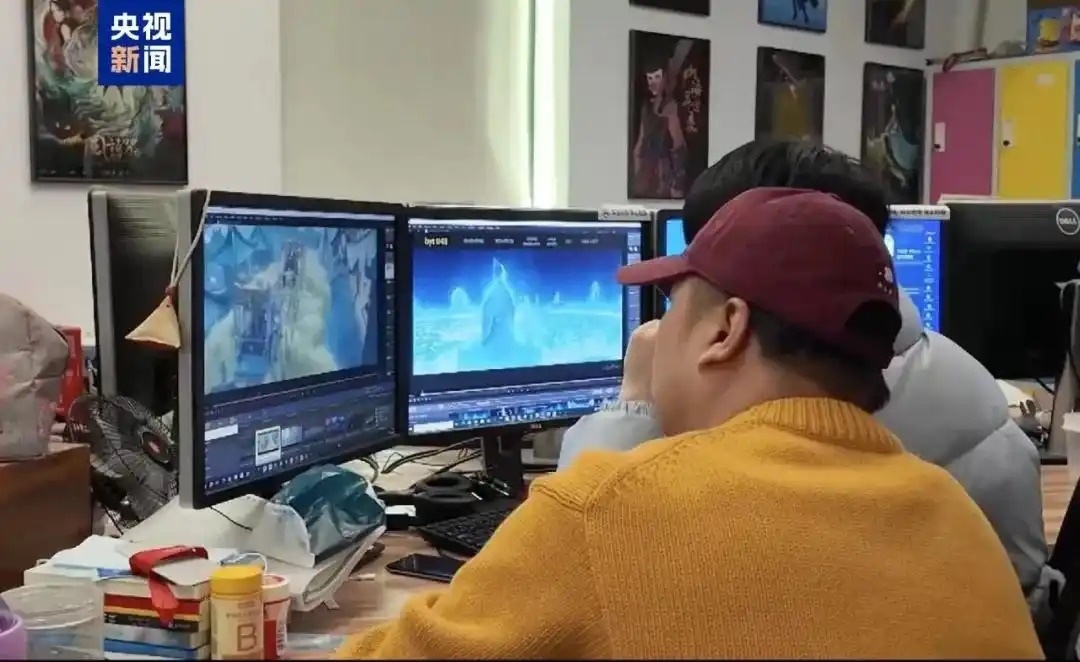 △《哪吒2》壯觀的特效背后,是全國138家動畫公司的合力托舉。圖為創(chuàng)作團隊正在確認(rèn)畫面效果。