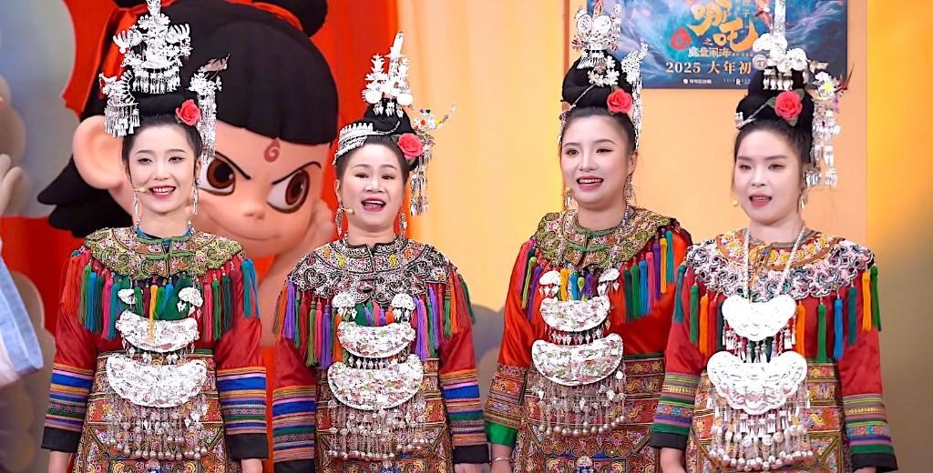 近日,貴州“舞樂蟬歌”樂團(tuán)的成員們,在電影《哪吒之魔童鬧?!返男麓呼[海直播現(xiàn)場表演侗族大歌。(受訪者供圖)