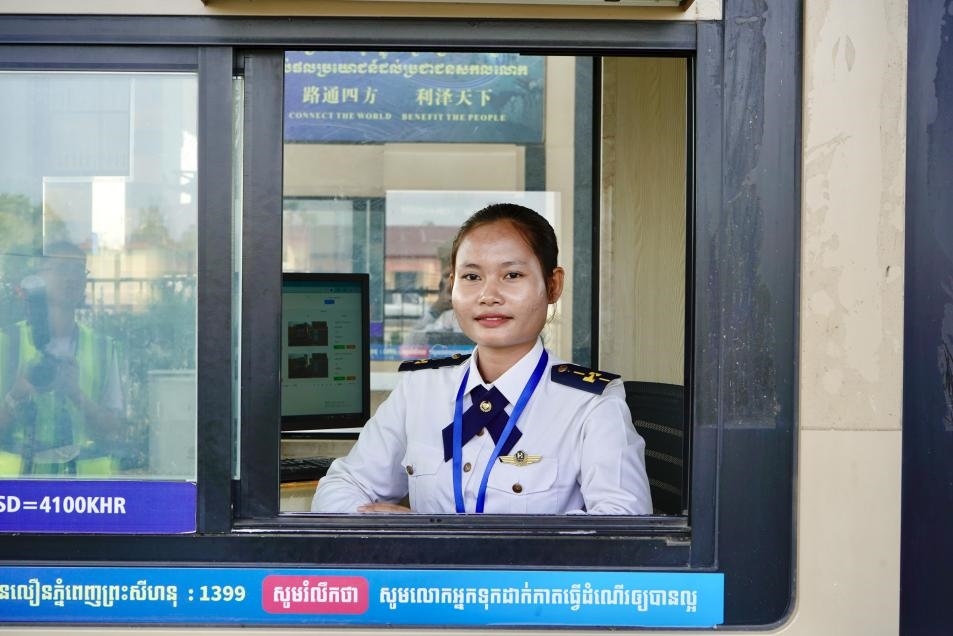 金港高速一處收費(fèi)站里,工作人員為往來(lái)車輛提供服務(wù)。(柬埔寨金港高速公路有限公司供圖)