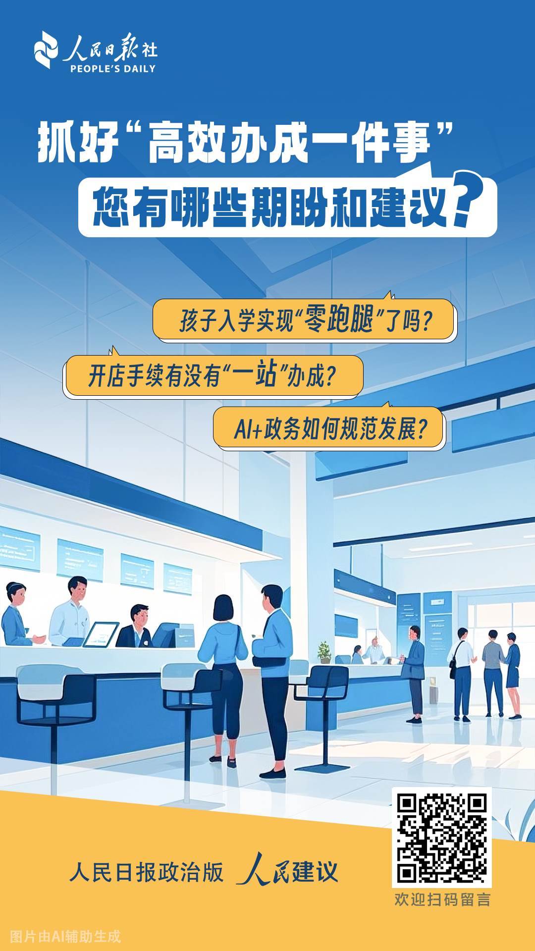 “高效辦成一件事”作為惠企利民的重要政策,如何落實更有效,讓企業(yè)群眾辦事更便利?人工智能又將為政務服務帶來哪些新場景?圍繞上述問題,人民日報政治版將聯合人民網“人民建議”,面向廣大網友開展有獎征集活動(點擊留言)。