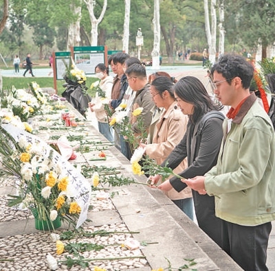 4月4日清明節(jié),湖北武漢江漢大學的師生自發(fā)前往武漢市解放公園,緬懷為阻擊日寇而英勇犧牲的蘇聯(lián)援華航空隊烈士。