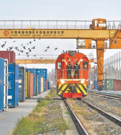 一列中歐班列緩緩駛入新疆霍爾果斯鐵路口岸站。