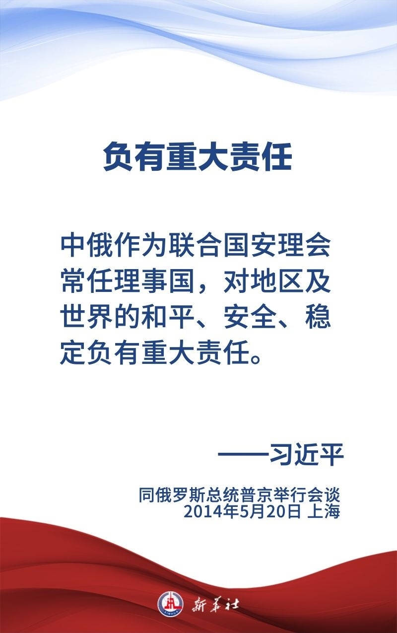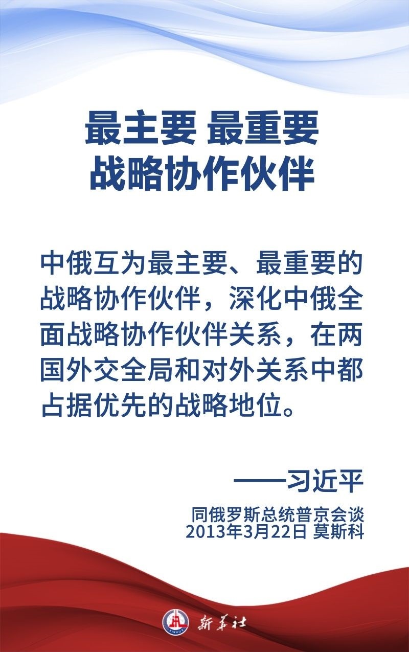 中俄關(guān)系歷經(jīng)風(fēng)雨,歷久彌堅(jiān),樹立了大國、鄰國永久睦鄰友好、全面戰(zhàn)略協(xié)作、互利合作共贏的典范。習(xí)近平主席和普京總統(tǒng)保持密切交往,為新時(shí)代中俄關(guān)系作出頂層設(shè)計(jì),提供戰(zhàn)略引領(lǐng)。在國事訪問等重要場(chǎng)合,習(xí)近平主席這樣論述中俄關(guān)系——