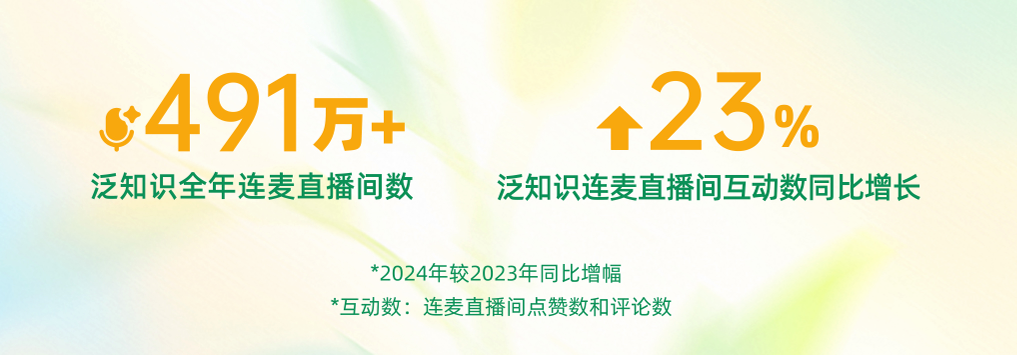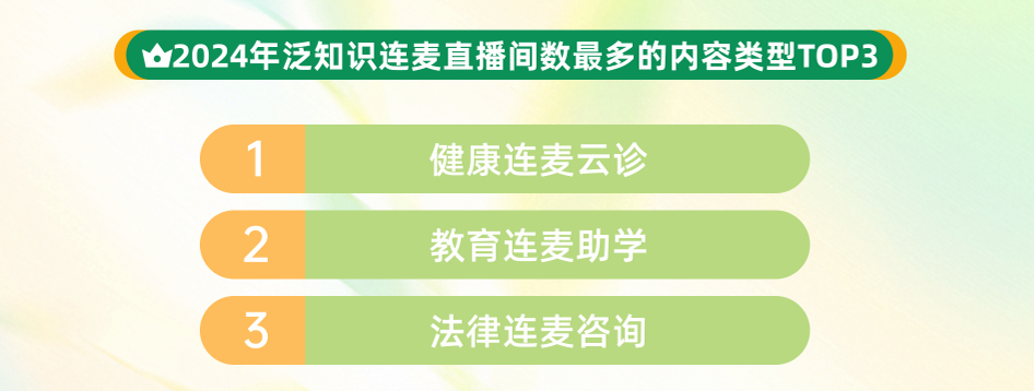 隨著用戶互動(dòng)與創(chuàng)作者投稿形成正向循環(huán),推動(dòng)生態(tài)雙向繁榮,連麥學(xué)習(xí)正重塑知識(shí)普惠的全新范式。數(shù)據(jù)顯示,2024年,快手泛知識(shí)連麥直播場(chǎng)次達(dá)491萬場(chǎng),直播間互動(dòng)量同比提升23%,健康咨詢、教育助學(xué)、法律咨詢位列連麥內(nèi)容前三。