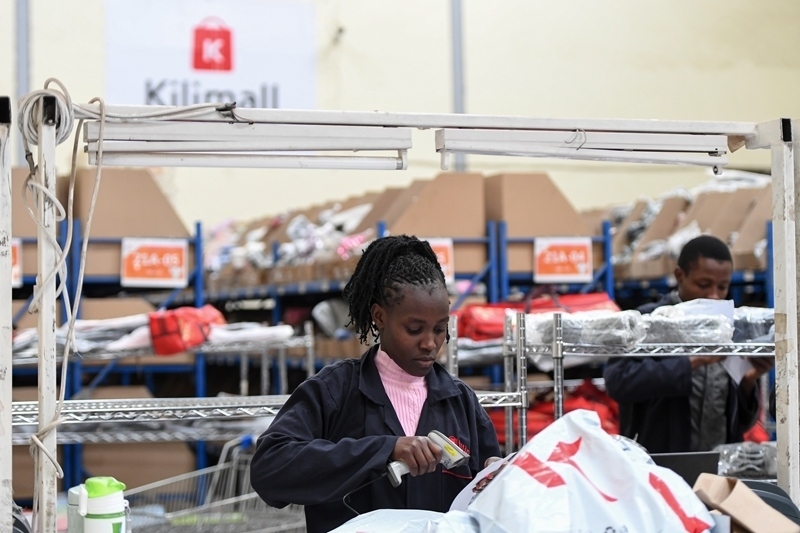 2023年4月20日,在肯尼亞姆洛隆戈,Kilimall員工在倉庫內(nèi)包裝商品出庫。新華社發(fā)(辜鵬博?攝)