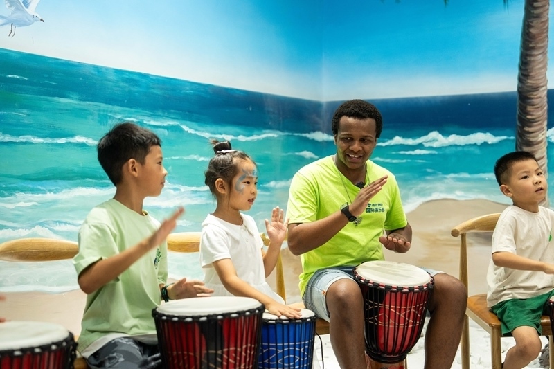 2024年8月30日,在位于湖南高橋大市場的中非經(jīng)貿(mào)博覽會(huì)常設(shè)展館安哥拉館,志愿者(右二)帶領(lǐng)學(xué)生學(xué)習(xí)非洲鼓。新華社記者 陳思汗 攝