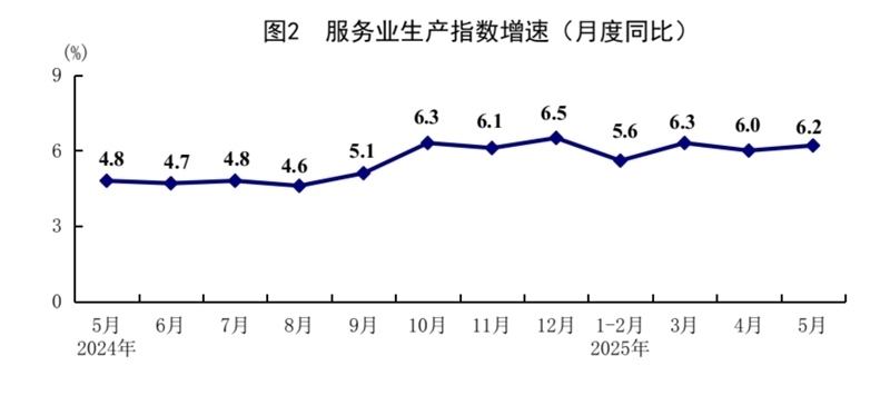 5月份,全國服務(wù)業(yè)生產(chǎn)指數(shù)同比增長6.2%,比上月加快0.2個百分點。分行業(yè)看,信息傳輸、軟件和信息技術(shù)服務(wù)業(yè),租賃和商務(wù)服務(wù)業(yè),批發(fā)和零售業(yè)生產(chǎn)指數(shù)同比分別增長11.2%、8.9%、8.4%,分別快于服務(wù)業(yè)生產(chǎn)指數(shù)5.0、2.7、2.2個百分點。1—5月份,全國服務(wù)業(yè)生產(chǎn)指數(shù)同比增長5.9%。1—4月份,規(guī)模以上服務(wù)業(yè)企業(yè)營業(yè)收入同比增長7.2%。5月份,服務(wù)業(yè)商務(wù)活動指數(shù)為50.2%,比上月上升0.1個百分點;服務(wù)業(yè)業(yè)務(wù)活動預(yù)期指數(shù)為56.5%,上升0.1個百分點。其中,鐵路運輸、航空運輸、郵政、電信廣播電視及衛(wèi)星傳輸服務(wù)、互聯(lián)網(wǎng)軟件及信息技術(shù)服務(wù)等行業(yè)商務(wù)活動指數(shù)位于55.0%以上較高景氣區(qū)間。