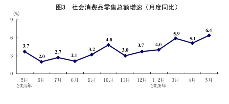5月份,社會消費品零售總額41326億元,同比增長6.4%,比上月加快1.3個百分點;環(huán)比增長0.93%。按經(jīng)營單位所在地分,城鎮(zhèn)消費品零售額36057億元,同比增長6.5%;鄉(xiāng)村消費品零售額5269億元,增長5.4%。按消費類型分,商品零售額36748億元,增長6.5%;餐飲收入4578億元,增長5.9%。基本生活類和部分升級類商品銷售增勢較好,限額以上單位糧油食品類、金銀珠寶類、體育娛樂用品類商品零售額分別增長14.6%、21.8%、28.3%。消費品以舊換新政策持續(xù)顯效,限額以上單位家用電器和音像器材類、通訊器材類、文化辦公用品類、家具類商品零售額分別增長53.0%、33.0%、30.5%、25.6%。1—5月份,社會消費品零售總額203171億元,同比增長5.0%。全國網(wǎng)上零售額60402億元,同比增長8.5%。其中,實物商品網(wǎng)上零售額49878億元,增長6.3%,占社會消費品零售總額的比重為24.5%。1—5月份,服務(wù)零售額同比增長5.2%。