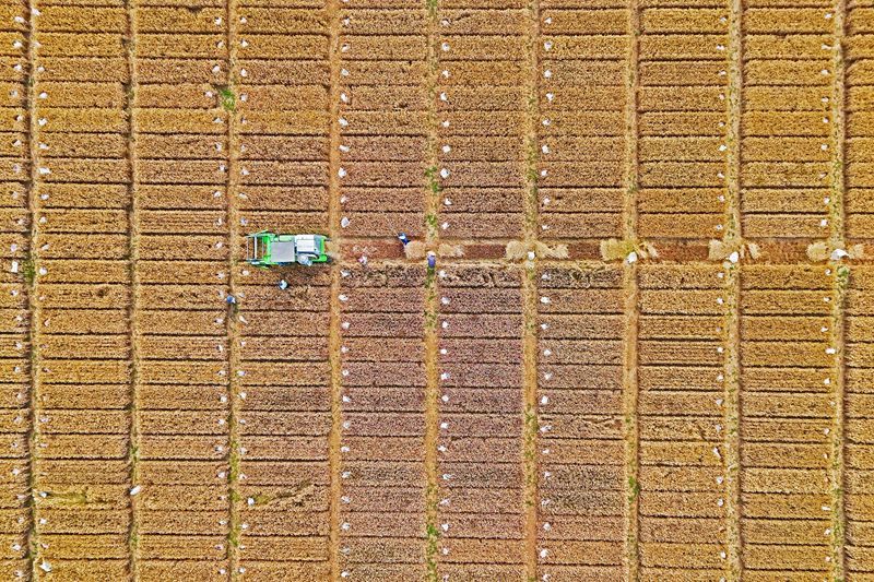 6月18日,收割機(jī)在山東省煙臺(tái)市一處試驗(yàn)田里收割小麥(無人機(jī)照片)。
