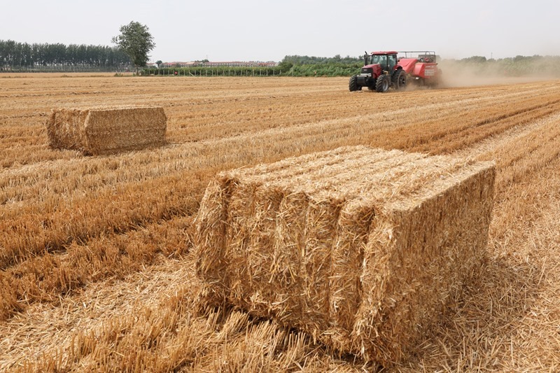 6月18日,在河北石家莊晉州市周家莊鄉(xiāng)北捏盤村麥田,農(nóng)戶駕駛秸稈打捆機(jī)作業(yè)。