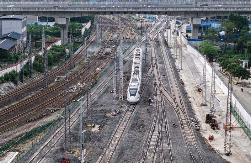 6月19日,在成渝中線高鐵成都站南北站場交替施工現(xiàn)場,中國中鐵電氣化局的施工人員在南站場進(jìn)行接觸網(wǎng)施工作業(yè)。