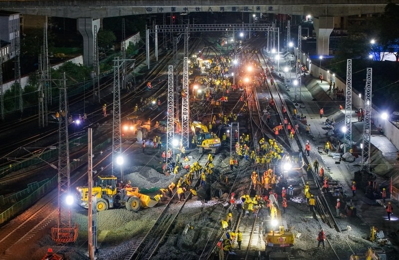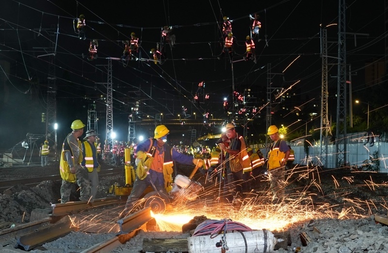 6月19日,在成渝中線高鐵成都站南北站場交替施工現(xiàn)場,中鐵八局施工人員在拆除原來的軌道和枕木,上方中國中鐵電氣化局的施工人員在進(jìn)行接觸網(wǎng)施工作業(yè)。