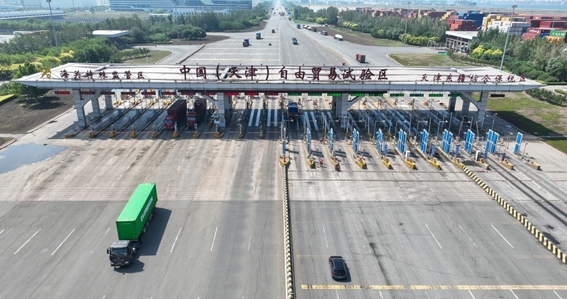 這是6月20日拍攝的天津自貿(mào)區(qū)天津港東疆片區(qū)入口處的中國(天津)自由貿(mào)易試驗區(qū)海關(guān)特殊監(jiān)管區(qū)入口(無人機(jī)照片)。