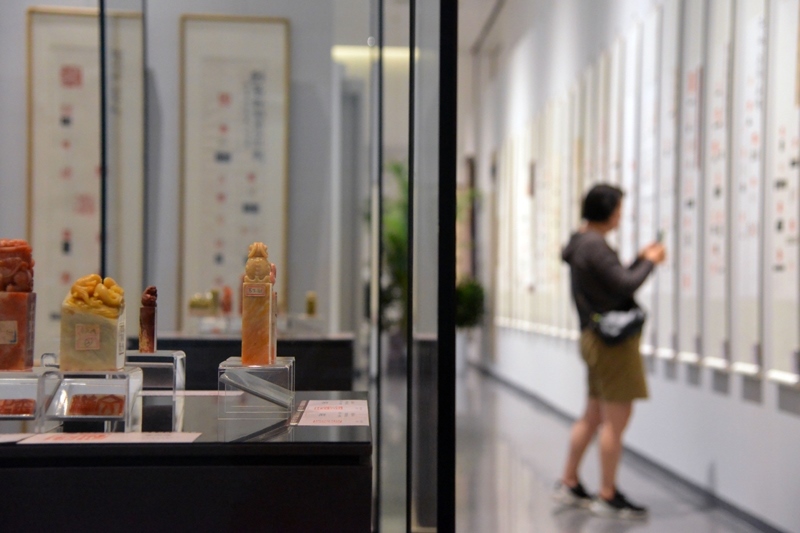 6月21日,觀眾在北京市海淀區(qū)三山五園文化藝術(shù)中心參觀薪傳國(guó)粹——“萬(wàn)印樓”新藏當(dāng)代國(guó)際篆刻精品展。