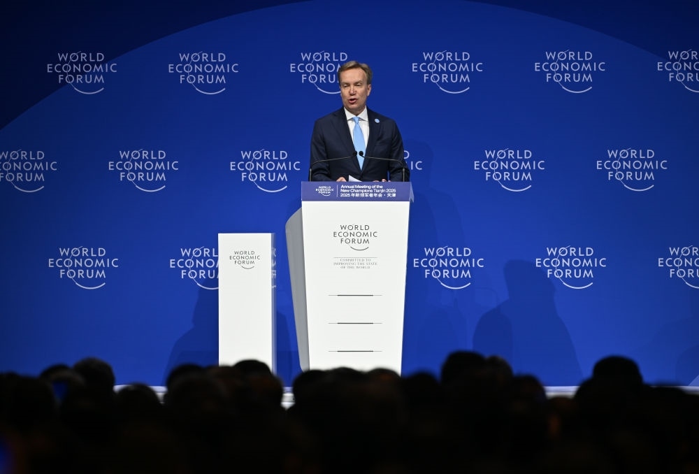 6月25日,世界經(jīng)濟(jì)論壇總裁博爾格·布倫德在2025夏季達(dá)沃斯論壇開幕式上發(fā)言。新華社記者 孫凡越 攝