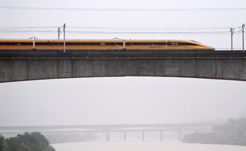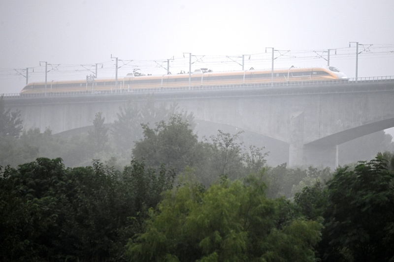9月11日,聯(lián)調(diào)聯(lián)試綜合檢測列車駛過位于陜西省西安市的西延高鐵渭河特大橋。
