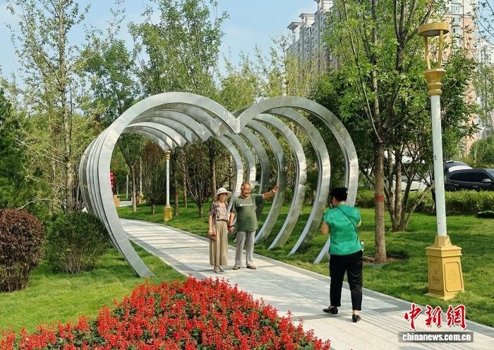 9月12日,民眾在山西省太原市迎澤大街月老廣場(chǎng)心形廊架下合影留念?!≈行律缬浾?李庭耀 攝