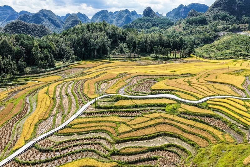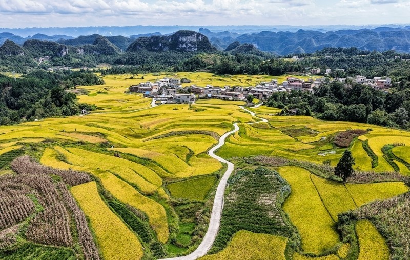 長(zhǎng)順縣長(zhǎng)寨街道中塘村的梯田風(fēng)光(9月17日攝,無(wú)人機(jī)照片)。