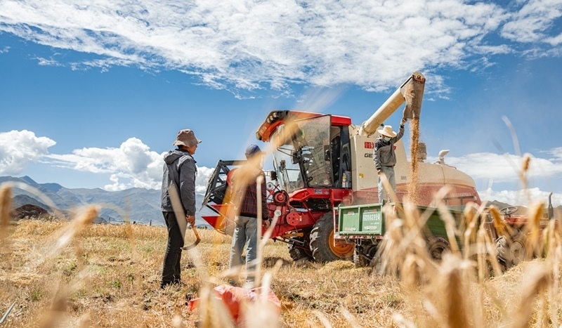 9月23日,在西藏拉薩市林周縣松盤鄉(xiāng)崗巴村,農(nóng)民用收割機收獲青稞。
