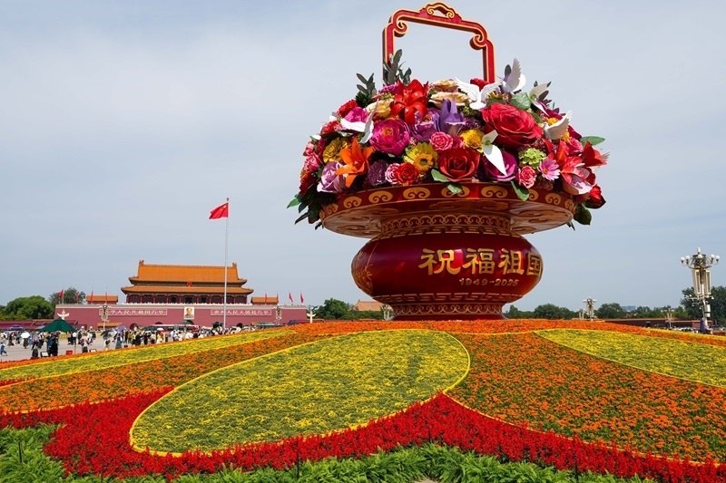 9月25日,2025年“祝福祖國”巨型花籃正式完工,亮相天安門廣場與市民共度佳節(jié)。今年“祝福祖國”花壇以喜慶的花籃為主景,花壇頂高18米,籃體高16米,籃盤直徑12米?;@體南側(cè)書寫“祝福祖國”“1949-2025”字樣,籃體北側(cè)書寫“歡度國慶”“1949-2025”字樣。籃內(nèi)選取了美好寓意的花卉,其中荷花寓意“和和美美”、橄欖枝寓意“榮耀和平”等,還結(jié)合和平鴿元素,體現(xiàn)“和平發(fā)展、欣欣向榮”。