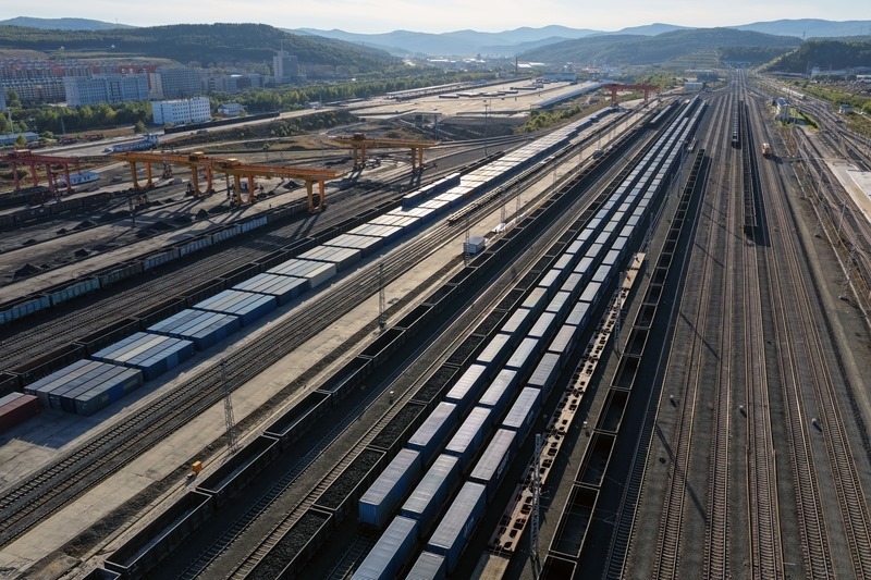 9月27日,滿載貨物的列車在綏芬河站北場(chǎng)進(jìn)行換裝作業(yè)(無(wú)人機(jī)照片)。