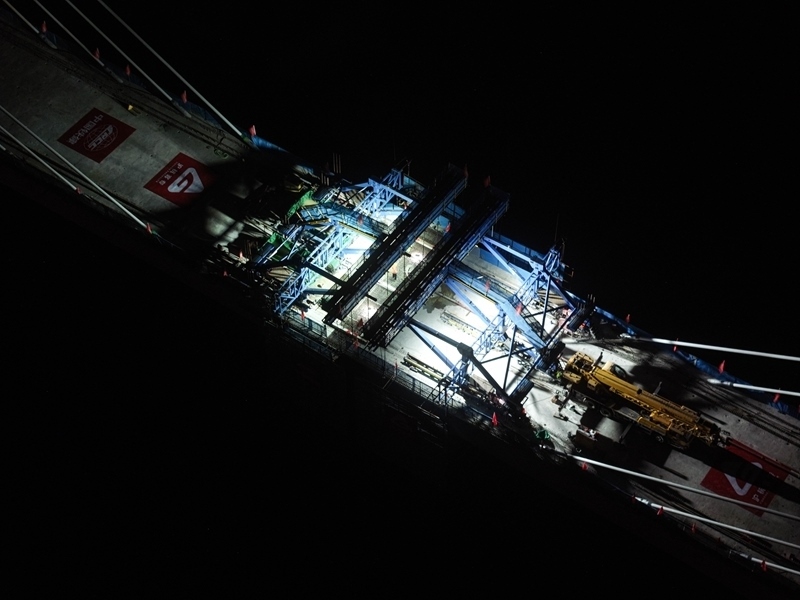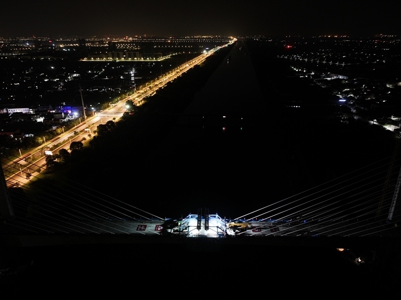 6月30日晚拍攝的滬渝蓉高鐵通泰揚(yáng)特大橋跨引江河斜拉橋施工現(xiàn)場(chǎng)(無(wú)人機(jī)照片)。