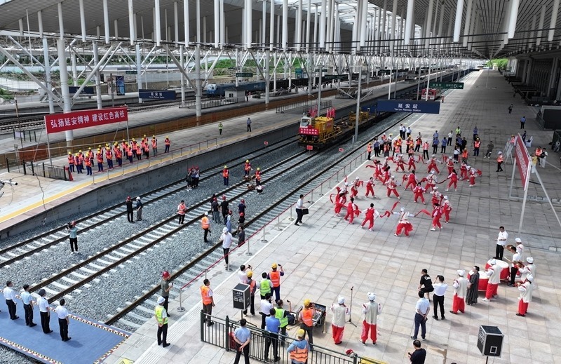 7月1日在延安站拍攝的西延高鐵軌道貫通儀式(無人機(jī)照片)。