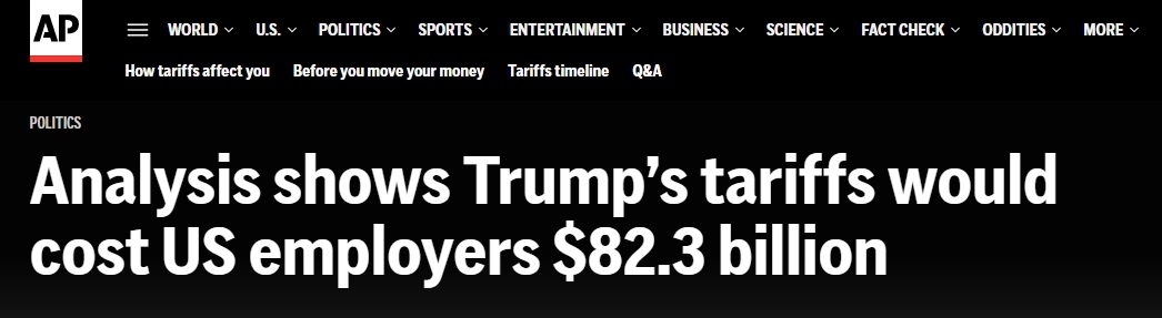 4月份,特朗普政府宣布所謂“對等關(guān)稅”政策后,金融市場出現(xiàn)恐慌。隨后,又設(shè)定了90天談判期,期間多數(shù)進(jìn)口商品面臨10%基準(zhǔn)稅率。報道稱,若4月2日的初始關(guān)稅維持不變,研究中所涉及的企業(yè)將承受更為高昂的1876億美元的額外成本。若按照現(xiàn)行稅率,823億美元成本平均到每位員工身上就是2080美元,相當(dāng)于年均薪資的3.1%。這一平均值涵蓋了無進(jìn)口業(yè)務(wù)與有進(jìn)口業(yè)務(wù)企業(yè)。