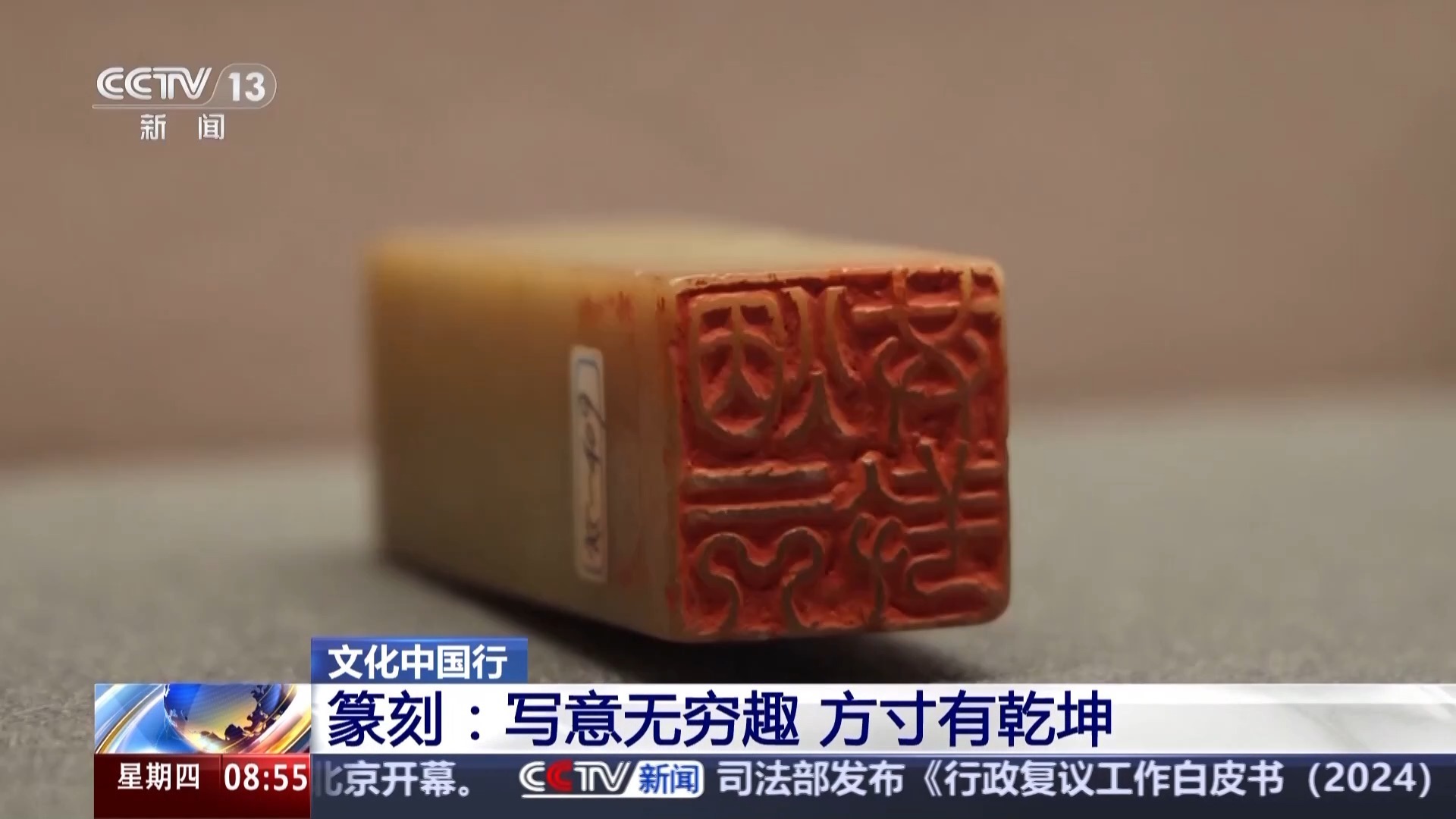 中國藝術(shù)研究院篆刻院院長 駱芃芃:篆刻藝術(shù)是用文字為表現(xiàn)對(duì)象的,主要是以篆書為主。它可以拉長可以縮短,這么抽象的幾個(gè)線條能表達(dá)那么豐富的意思,這就是我們中國人對(duì)世界哲學(xué)最偉大的貢獻(xiàn)之一。