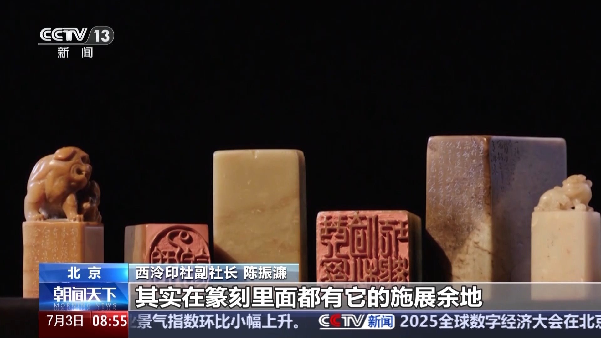 西泠印社副社長 陳振濂:或者是流暢的,或者是坎坷的,各種各樣的線條,其實(shí)在篆刻里面都有它的施展余地。一起一伏一頓一挫里面都是生命的脈動(dòng)。