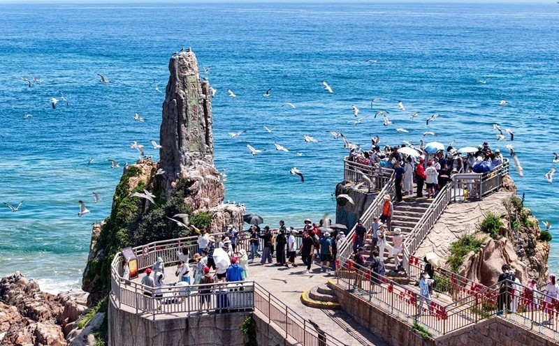 7月12日,山東省榮成市成山頭風(fēng)景區(qū),游客與黑尾鷗互動(dòng)(無人機(jī)照片)。