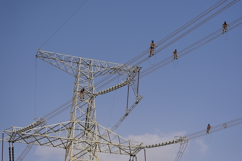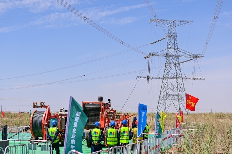 在民豐-且末750千伏線路,作業(yè)人員進(jìn)行導(dǎo)線架設(shè)工作(7月11日攝)。