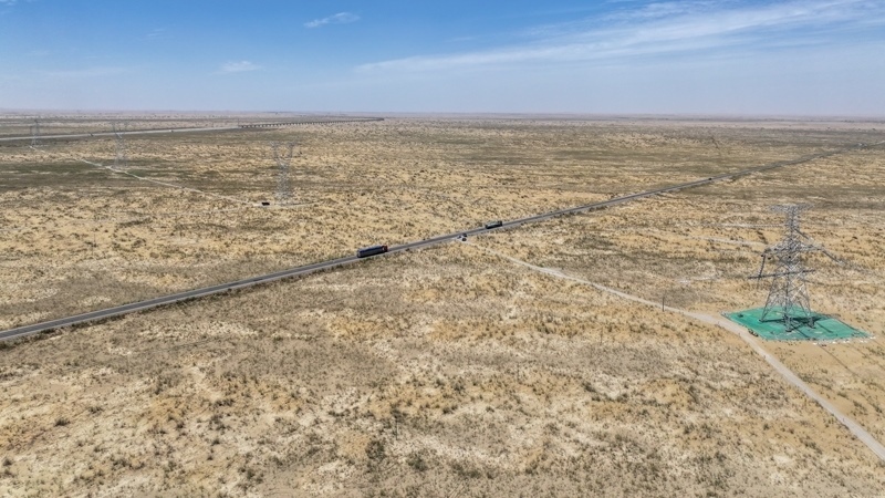 新疆環(huán)塔里木盆地750千伏輸電線路穿越“死亡之海”塔克拉瑪干沙漠(6月25日攝)。