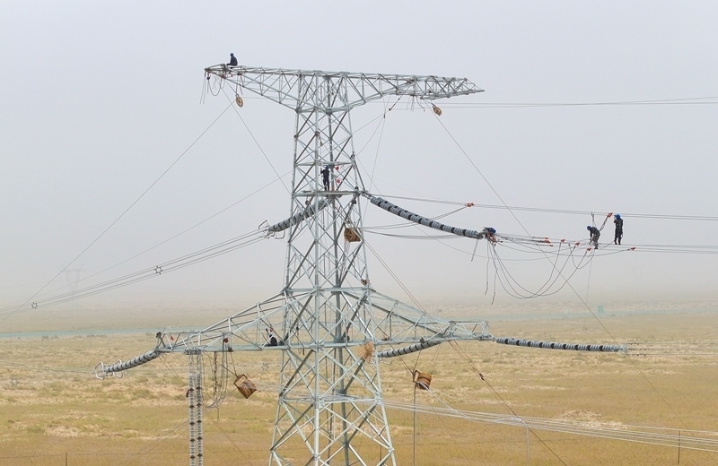 7月13日,在塔里木盆地南緣的新疆和田地區(qū)民豐縣,隨著牽引機(jī)將最后一段電線成功從183號(hào)鐵塔拽至188號(hào)鐵塔,標(biāo)志著歷時(shí)15年建設(shè)的環(huán)塔里木盆地750千伏輸變電工程全線貫通,形成了一條圍繞塔里木盆地的750千伏超高壓輸電環(huán)網(wǎng)。