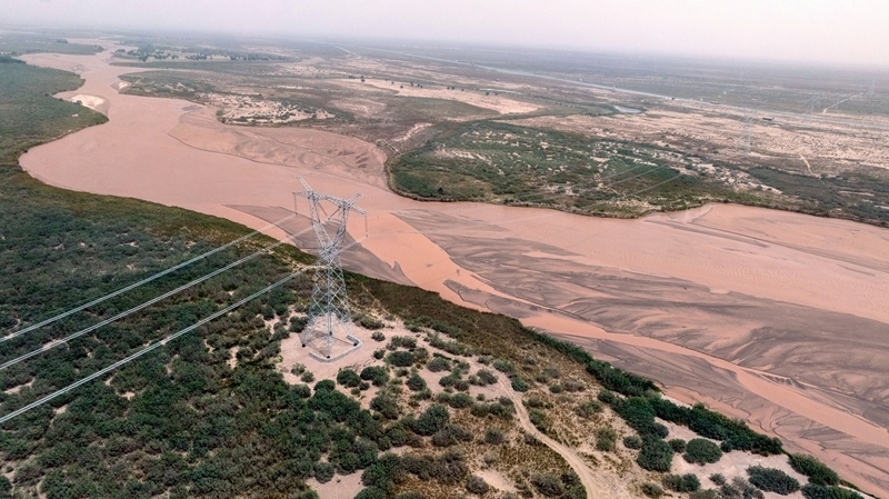 新疆環(huán)塔里木盆地750千伏輸電線路跨越車(chē)爾臣河(6月14日攝)。