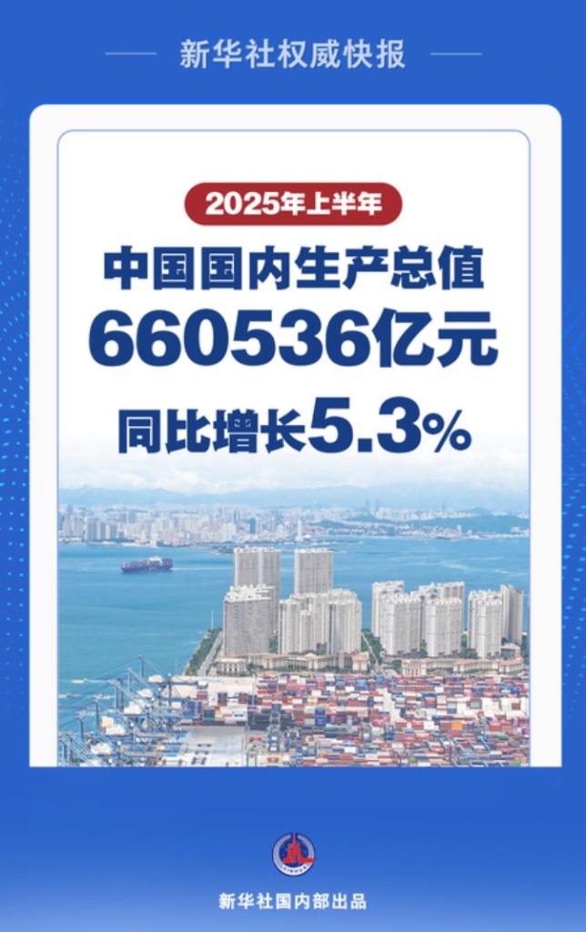 7月15日,國家統(tǒng)計局發(fā)布數(shù)據(jù)顯示,上半年,中國國內(nèi)生產(chǎn)總值(GDP)660536億元,按不變價格計算,同比增長5.3%。