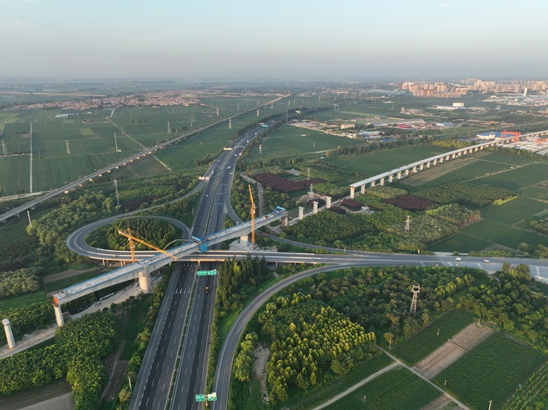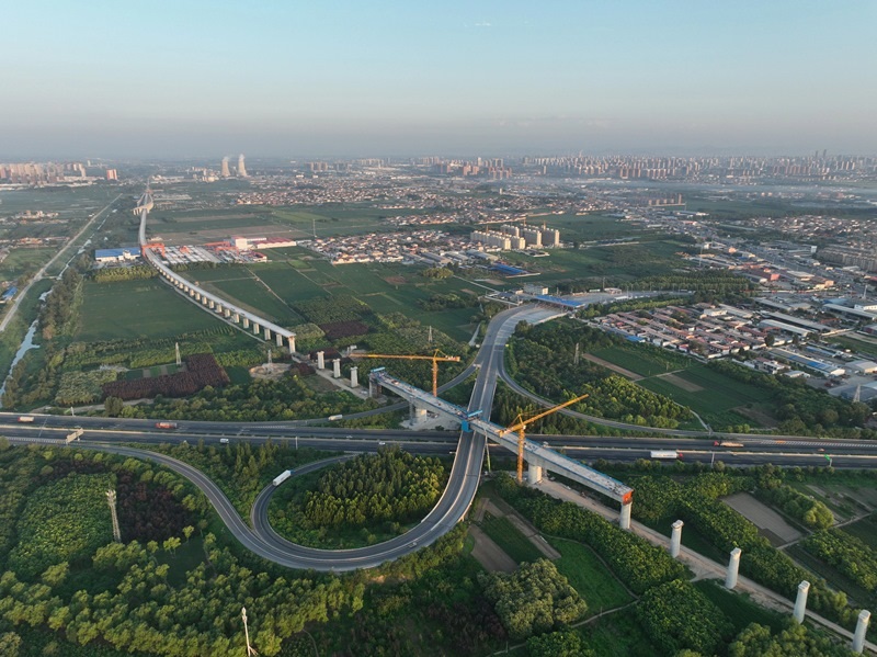 7月18日拍攝的雄忻高鐵保定東特大橋跨京港澳高速連續(xù)梁中跨施工現(xiàn)場(chǎng)(無(wú)人機(jī)照片)。