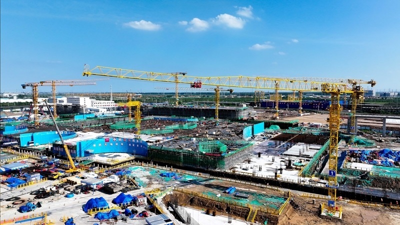 7月25日,在津?yàn)H高鐵山東東營(yíng)高鐵站現(xiàn)代綜合客運(yùn)樞紐及配套工程建設(shè)現(xiàn)場(chǎng),中鐵二十局工作人員在施工(無(wú)人機(jī)照片)。