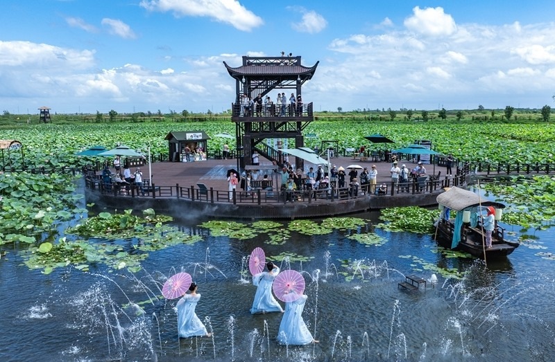 7月26日,游客在江蘇省興化市萬畝荷塘景區(qū)觀看表演(無人機照片)。
