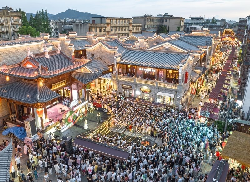 7月25日,游客在湖北省襄陽古城管家巷文化休閑街區(qū)觀看星光音樂會(無人機照片)。