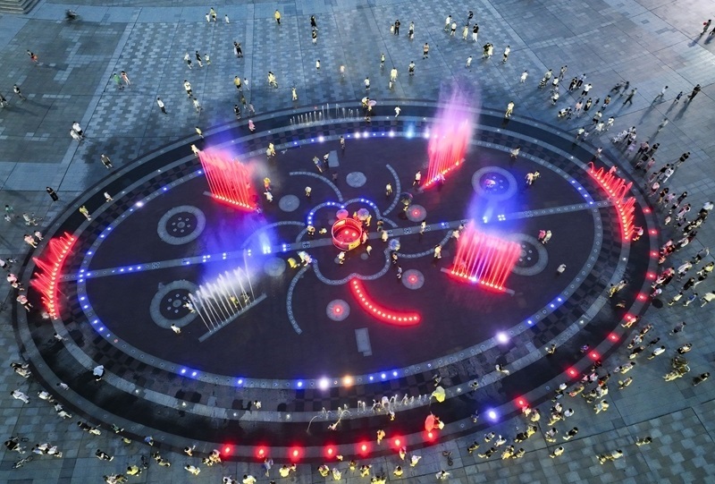 7月24日,市民和游客在河南省濟源市世紀廣場賞噴泉納清涼(無人機照片)。