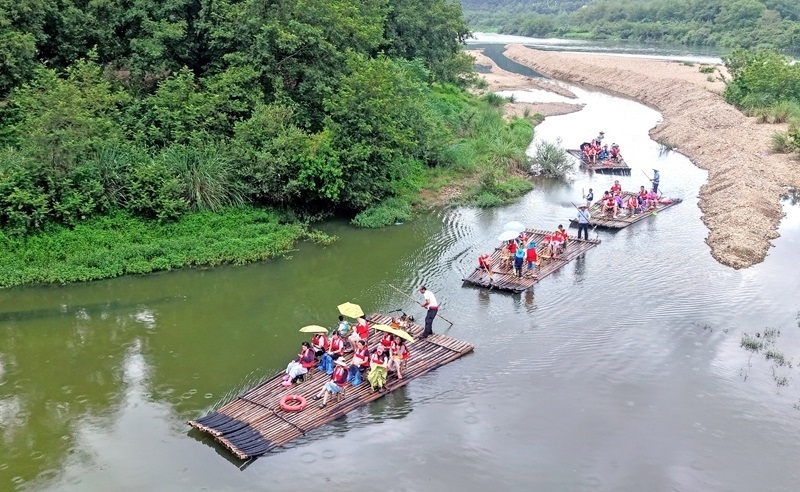 7月25日,游客在浙江省臺州市仙居縣永安溪乘坐竹筏漂流(無人機照片)。