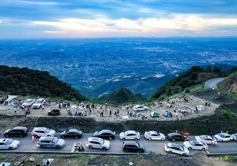 7月25日,四川省華鎣市市民駕車來到華鎣山21道拐避暑納涼(無人機照片)。