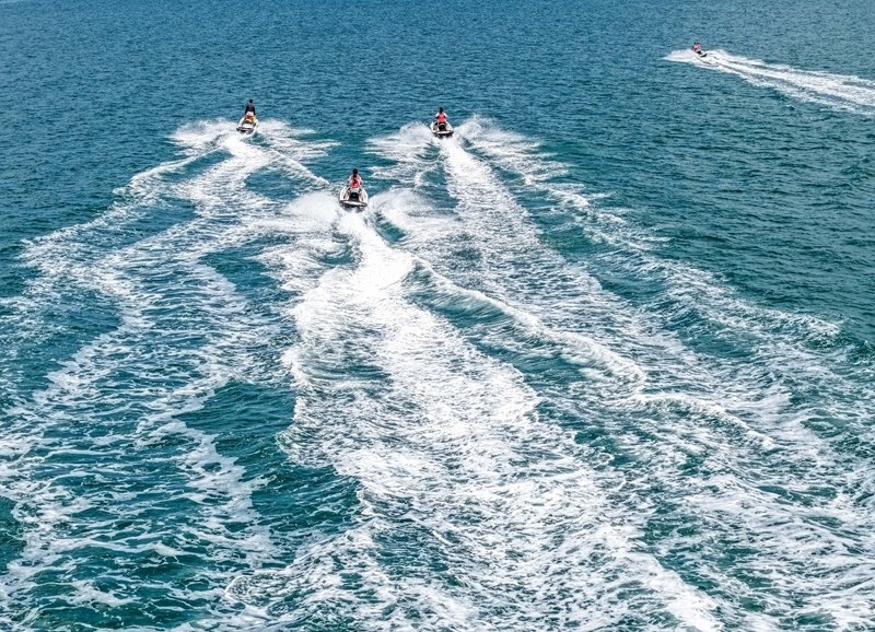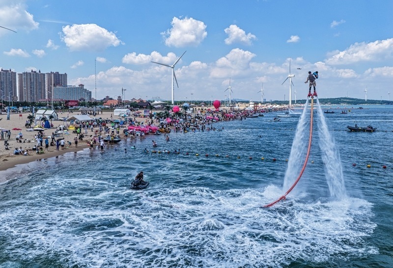 7月24日,游客在山東省榮成市那香海國際旅游度假區(qū)體驗摩托艇(無人機照片)。