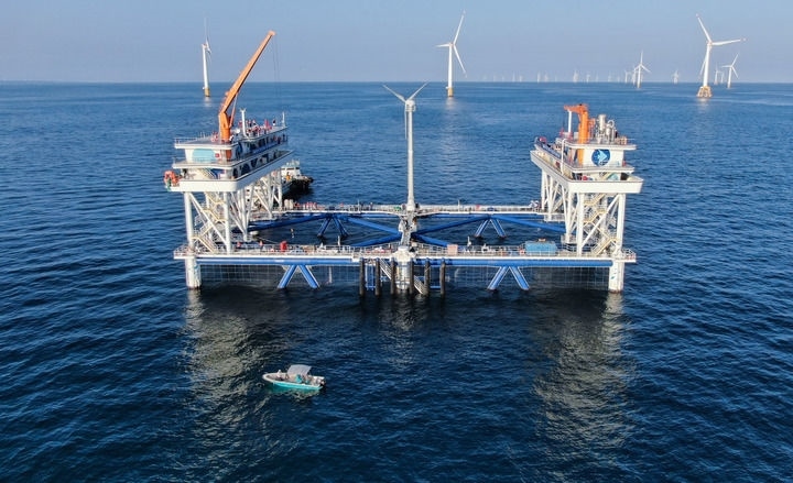 這是在廣東汕尾拍攝的中廣核“伏羲一號”風(fēng)漁融合網(wǎng)箱平臺(2024年9月2日攝,無人機(jī)照片)。新華社記者 鄧華 攝