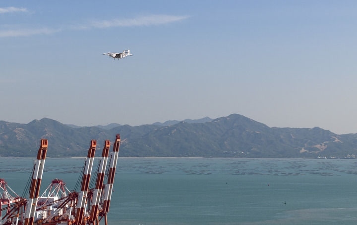 豐翼科技(深圳)有限公司的一架無人機(jī)搭載著快件從深圳蛇口集裝箱碼頭附近的起降點(diǎn)起飛,準(zhǔn)備飛往中山(2024年11月27日攝)。新華社記者 毛思倩 攝